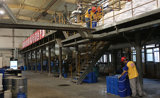 上述是工人在珊绿美缝剂工厂原料储藏间。